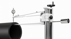 Mit dem Wanddickenmessgerät Modell 1049 können die Wanddicken von Rohren mit hoher Genauigkeit gemessen werden. Die Messung erfolgt hierbei über eine Präzisions-Messuhr, welche auf dem oberen Arm der Messgabel montiert ist. Ein einstellbares Gegengewicht ermöglicht zudem die Anpassung des Anpressdrucks des unteren Armes der Messgabel. Über ein Handrad kann die Messgabel in der Höhe verstellt werden. Ein verschiebbarer Schlitten ermöglicht das Verfahren der Messgabel in Längsrichtung. Dadurch können Messungen der Wandstärke an beliebigen Punkten des Rohrstücks durchgeführt werden. Für Rohre mit kleineren Durchmessern ist ein entsprechender Aufsatz für den unteren Arm der Messgabel im Lieferumfang enthalten. Das Gerät besitzt eine Auflage in die das zu prüfende Rohr eingelegt wird. Über die darin integrierten Rollen können auch größere Rohre leicht um die Längsachse gedreht werden.